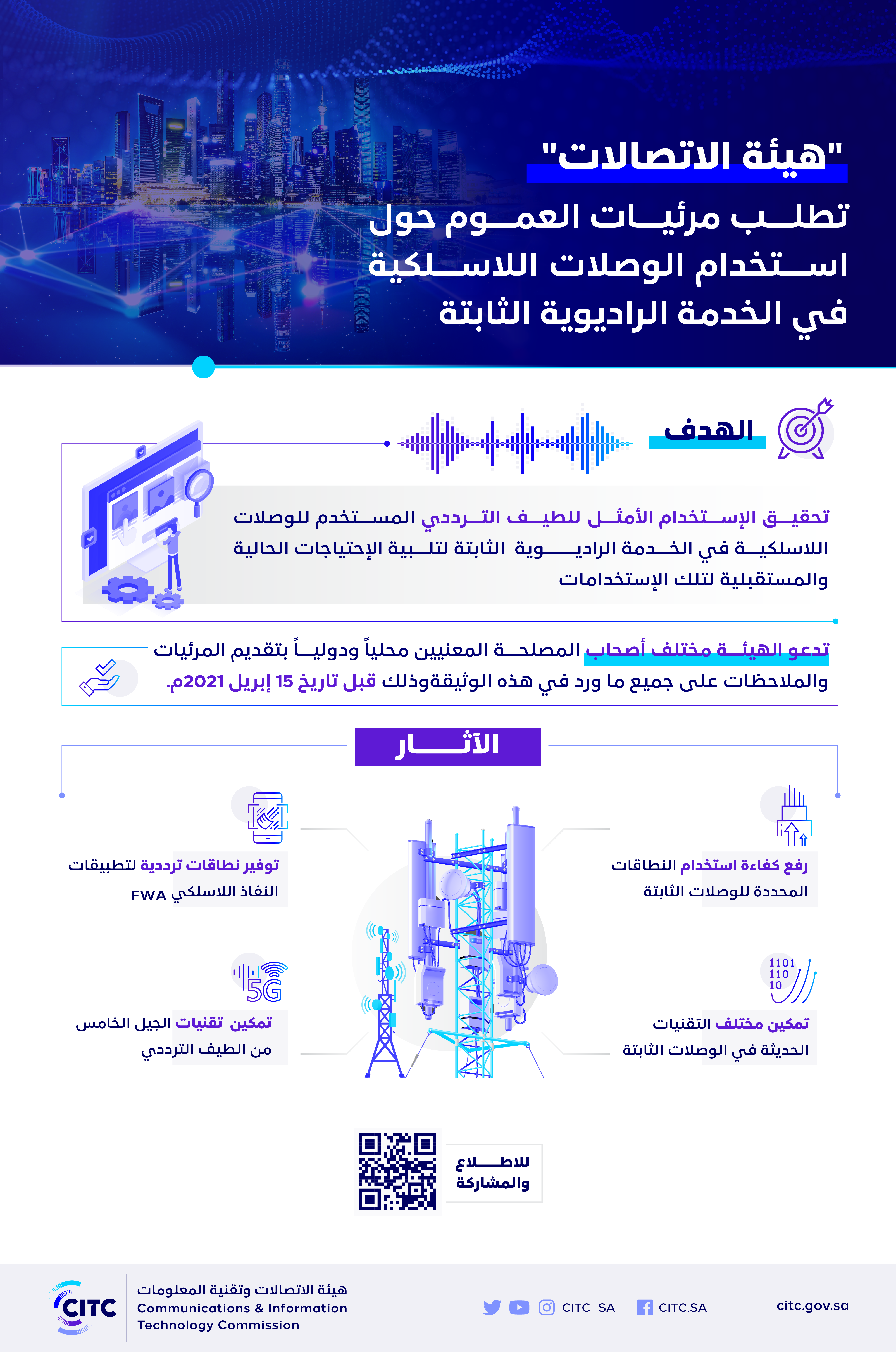 ودعت مختلف المهتمين والمتخصصين محلياً ودولياً بتقديم المرئيات والملاحظات على جميع ما ورد في هذه الوثيقة، من خلال الرابط التالي: https://www.citc.gov.sa/ar/new/publicConsultation/Pages/144203.aspx، وذلك قبل تاريخ 15 إبريل 2021م.