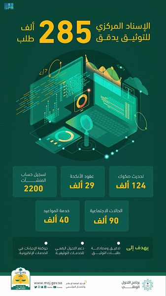 وأوضحت الوزارة، أن قائمة الطلبات اشتملت على أكثر من 124 ألف طلب تحديث صكوك، و2200 تسجيل حساب منشآت، و29 ألف تصديق عقود أنكحة، و40 ألف خدمة مواعيد، إضافة إلى نحو 90 ألف طلب حالات اجتماعية.