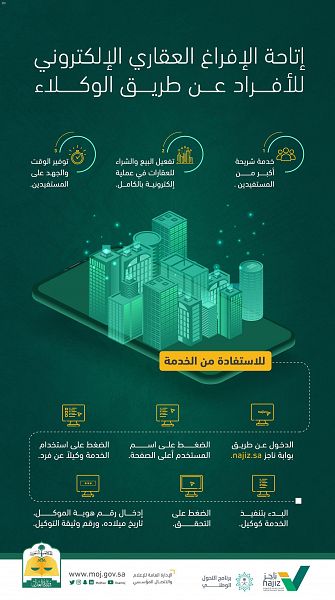 أطلقت وزارة العدل خدمة الإفراغ العقاري الإلكتروني عن طريق الوكلاء للأفراد، ضمن سعيها إلى خدمة أكبر شريحة ممكنة من المواطنين، وتفعيل البيع والشراء للعقارات في عملية إلكترونية بالكامل، للتيسير على المستفيدين وتوفير الوقت والجهد عليهم.