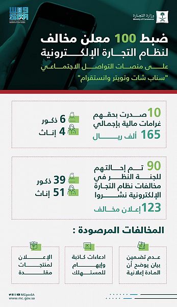 ضبطت وزارة التجارة 100 معلنٍ ومعلنة لمخالفتهم ضوابط الإعلان الإلكتروني التي نص عليها نظام التجارة الإلكترونية ولائحته التنفيذية في منصات سناب شات وتويتر وانستقرام .