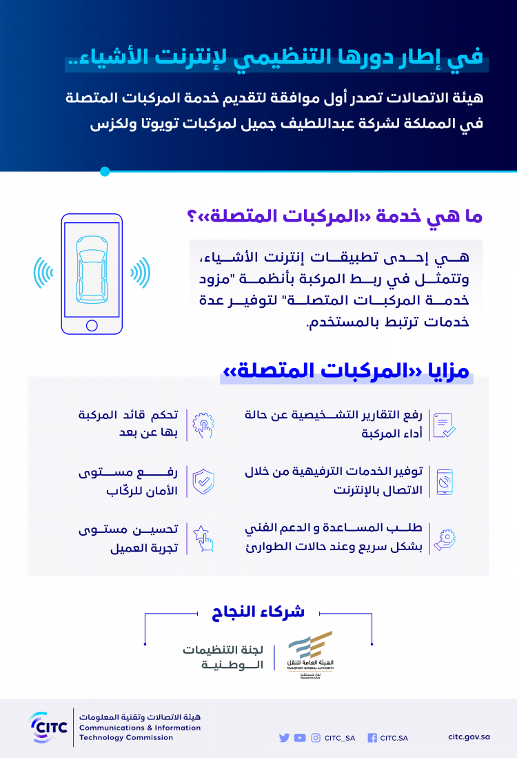 أصدرت هيئة الاتصالات وتقنية المعلومات، بالتعاون مع الهيئة العامة للنقل ولجنة التنظيمات الوطنية، موافقتها الأولى لتقديم خدمة «المركبات المتصلة» في المملكة لشركة “عبداللطيف جميل، لمركبات تويوتا ولكزس”، في إطار دور الهيئة التنظيمي لقطاع تقنية المعلومات والتقنيات الناشئة، وسعيها نحو تحفيز وتمكين الابتكار في المملكة، وتعزيز الاستفادة من هذه التقنيات وإسهامها الاقتصادي والاجتماعي، والعمل على تحقيق الاستفادة القصوى من خدمات الاتصالات وتقنية المعلومات مما يسهم في جعل المملكة ضمن الدول الرائدة في استخدام وتطوير التقنيات التي تساهم في تحسين جودة الحياة والمساهمة في تحقيق أهداف رؤية 2030.