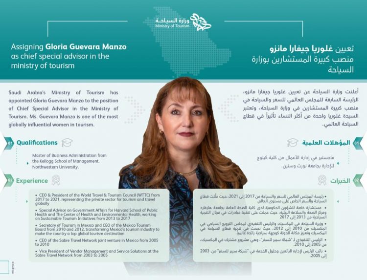 أعلنت وزارة السياحة، عن تعيين غلوريا جيفارا مانزو، وزيرة السياحة في المكسيك سابقاً رئيسة المجلس العالمي للسفر والسياحة السابقة، في منصب كبيرة المستشارين.