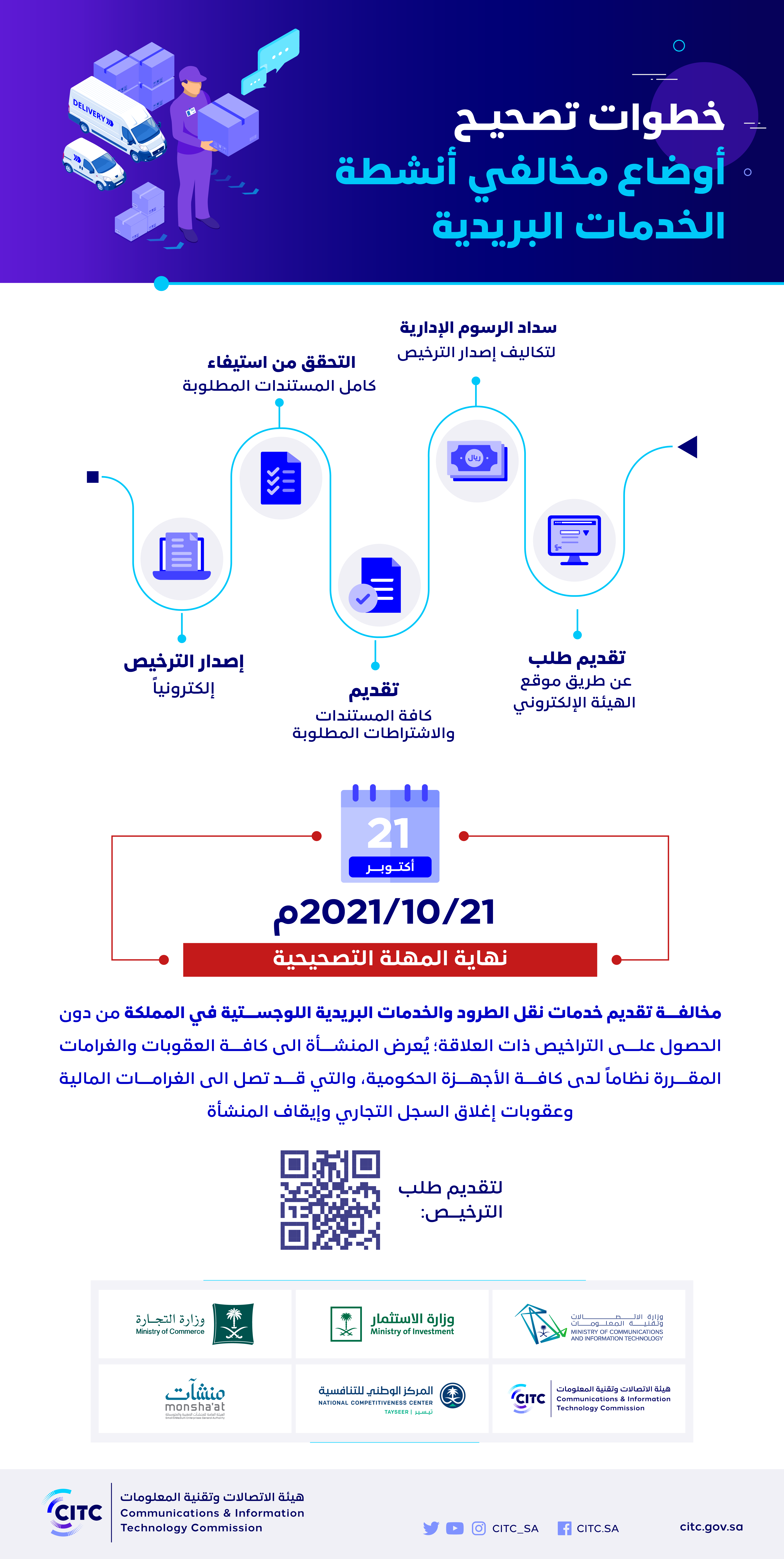 أعلنت هيئة الاتصالات وتقنية المعلومات بالتعاون مع وزارة التجارة والمركز الوطني للتنافسية عن بدء المهلة التصحيحية للمنشآت والأفراد العاملين في تقديم الأنشطة المتعلقة بخدمات البريد في المملكة دون ترخيص وبشكل مخالف للأنظمة، ودخولها حيز التنفيذ لمدة 6 أشهر تنتهي في 15 ربيع الأول 1443هـ الموافق 21 أكتوبر 2021م، لتسهيل إجراءات الحصول على التراخيص اللازمة في هذا القطاع، وذلك بهدف حماية حقوق المستفيدين من الخدمات البريدية وتعزيز جودة الخدمة المقدمة لهم وتحقيق المنافسة العادلة في السوق.