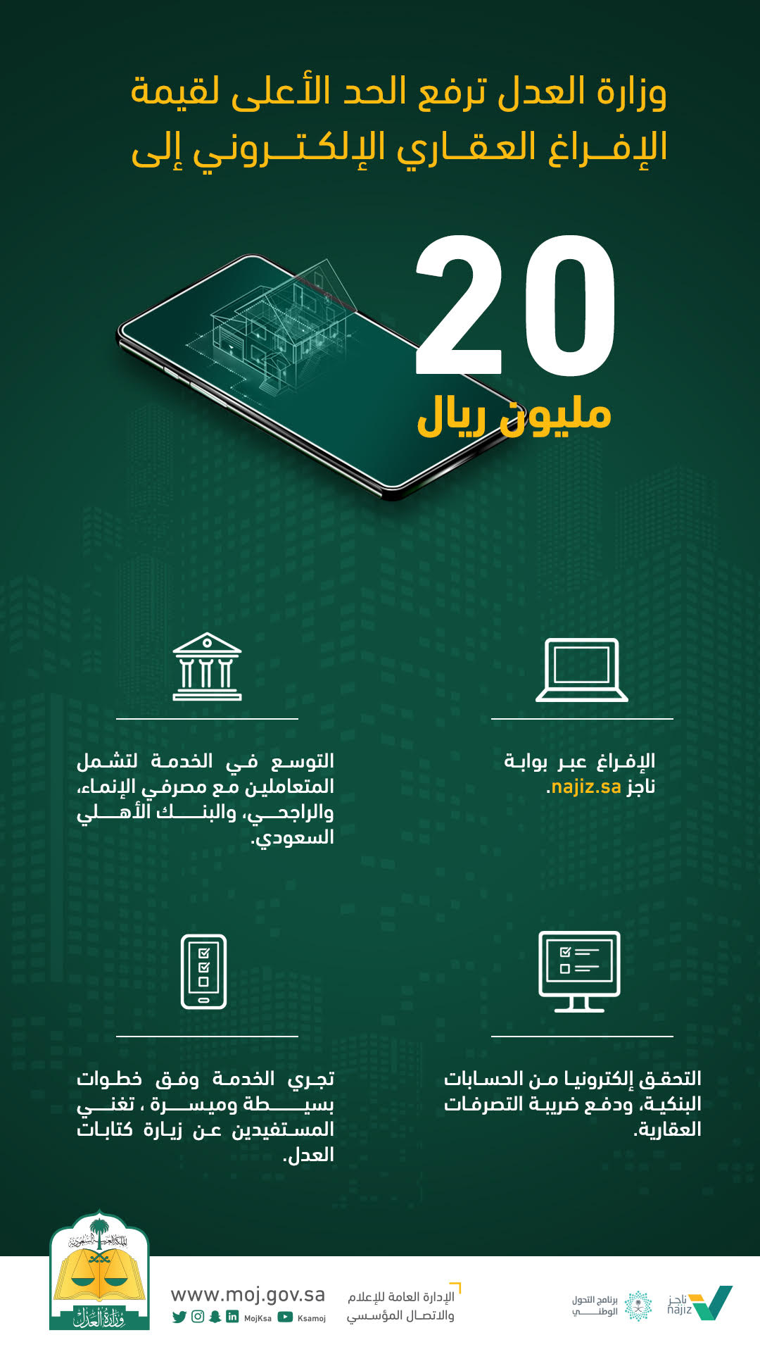 كشفت وزارة العدل عن رفع الحد الأعلى لقيمة العقارات التي يرغب ملاكها بإفراغها إلكترونيًا عبر بوابة ناجز الإلكترونية من ثلاثة ملايين ريال إلى 20 مليون ريال، للمستفيدين المتعاملين مع مصرفي الإنماء والراجحي، إضافة إلى البنك الأهلي السعودي، وذلك بالتعاون مع البنك المركزي السعودي.