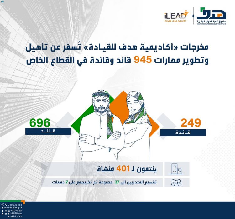 أسفرت مخرجات أكاديمية “هدف” للقيادة، منذ إطلاقها عن تأهيل وتطوير مهارات قيادات القطاع الخاص والبالغ عددهم 945 منهم 696 ذكور و249 إناث، ينتمون لـ 401 منشأة في مختلف مناطق ومدن ومحافظات المملكة.