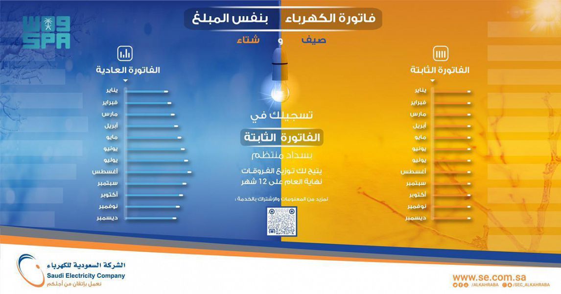 وأبانت “السعودية للكهرباء”، أن “الفاتورة الثابتة” مُتاحة لجميع المشتركين في القطاعات السكني، التجاري، الزراعي والصناعي، باستثناء المشتركين الحكوميين، مشيرة إلى أنه يمكن التسجيل في هذه الخدمة، عبر موقع الشركة الإلكتروني www.se.com.sa، أو من خلال تطبيق الكهرباء ALKAHRABA أو عبر الرقم الموحد 920001100.