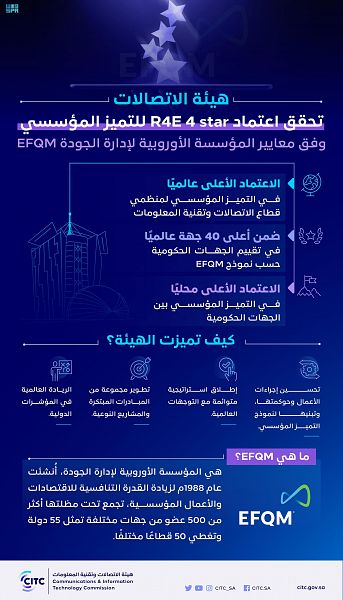 أعلنت هيئة الاتصالات وتقنية المعلومات عن حصولها على اعتماد التميز المؤسسي (Recognized For Excellence 4 Stars) من المؤسسة الأوروبية لإدارة الجودة “”EFQM, وذلك نظير إطلاقها لمجموعة من المبادرات النوعية التي ساعدت في تحسين إجراءات الأعمال وحوكمتها، وتبنيها لنموذج التميز المؤسسي، واستيفائها لمعايير تقييم الممكنات و النتائج المدرجة في نموذج التقييم المرتبط بمستوى (4 Star) التي تركّز على كفاءة التشغيل والتميز في نتائج الأداء المؤسسي.