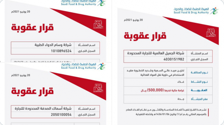 كما عاقبت منشأة غذائية (شركة أسماك الصدفة المحدودة للتجارة ومقرها محافظة جدة) بغرامة مالية قدرها 500 ألف ريال، لمخالفتها قرار الهيئة العامة للغذاء والدواء رقم 21174 وتاريخ 06/05/1439هـ، باستيراد أسماك محظورة وتغيير بلد المنشأ واسم الصنف الفعلي للأسماك.