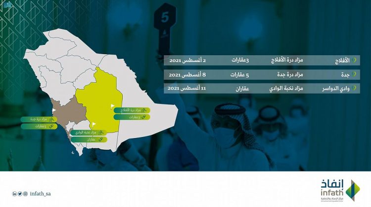 أعلن مركز الإسناد والتصفية “إنفاذ” عن إقامة عِدة مزادات إلكترونية، وهي: «مزاد درة الأفلاج»، الذي يبدأ يوم الإثنين الموافق 2 / 8 / 2021م ويستعرض 3 فرص استثمارية تتمثل في عمارة تجارية سكنية وفلتين في محافظة الأفلاج، بمساحات تتجاوز 2600 متر مربع، و «مزاد درة جِدة» الذي يبدأ يوم الأحد الموافق 8 / 8 / 2021م، لتصفية 5 عقارات تتمثل في أراضٍ تجارية وسكنية، بمساحات إجمالية تتجاوز 408 آلاف متر مربع، بالإضافة إلى «مزاد نخبة الوادي» الذي يبدأ 11 / 8 / 2021م ويستعرض فرصتين استثماريتين تتمثل في ورشة وأرض فضاء بمساحة تتجاوز 1,560,000 متر مربع في محافظة وادي الدواسر.