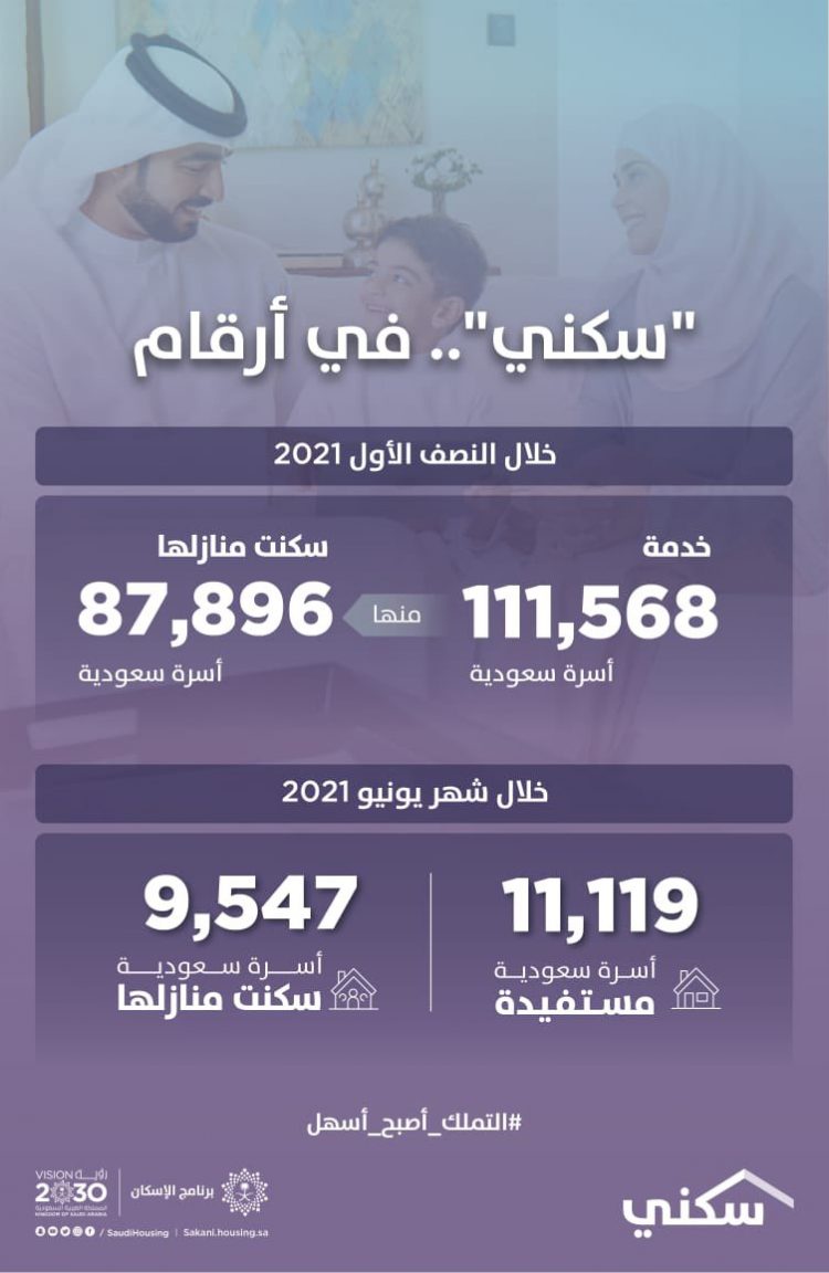 كشف برنامج “سكني” عن استفادة 111,568 أسرة من خياراته وحلوله السكنية المتنوعة خلال النصف الأول من العام الجاري 2021، منها 87,896 أسرة سكنت منازلها، ويأتي ذلك استمراراً لجهود البرنامج في تمكين الأسر السعودية من التملّك السكني تماشياً مع مستهدفات برنامج الإسكان أحد برامج رؤية المملكة 2030، بالوصول بنسبة التملّك السكني إلى 70% بحلول العام 2030.