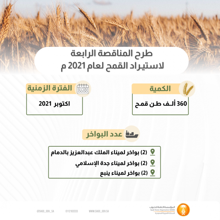 أعلنت المؤسسة العامة للحبوب عن طرح المناقصة الرابعة لهذا العام لاستيراد كمية (360) ألف طن قمح للتوريد خلال شهر أكتوبر 2021.