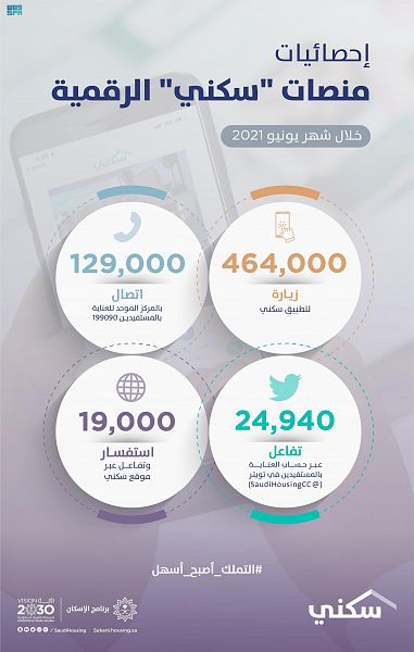 بلغ متوسط زيارات تطبيق برنامج “سكني” للأجهزة الذكية نحو 16 ألف زيارة في اليوم خلال شهر يونيو الماضي 2021، وتواصل منصّات برنامج “سكني” الرقميّة تقديم خدماتها الإلكترونية للأسر السعودية عبر موقع وتطبيق “سكني” ضمن جهود البرنامج لتسهيل تملك المسكن الأول وفق إجراءات سهلة وميسرة للوصول إلى نسبة تملك 70% بحلول 2030 ضمن مستهدفات برنامج الإسكان “أحد برامج رؤية المملكة 2030”.
