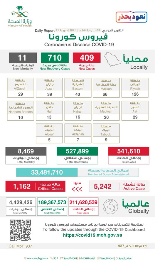 اعلنت وزارة الصحة السعودية تسجيل (409) حالة إصابة جديدة بفيروس كورونا (كوفيد-19)، وتسجيل (11) حالات وفيات رحمهم الله، وتسجيل (710) حالة تعافي ليصبح إجمالي عدد الحالات المتعافية (527,899) حالة ولله الحمد.