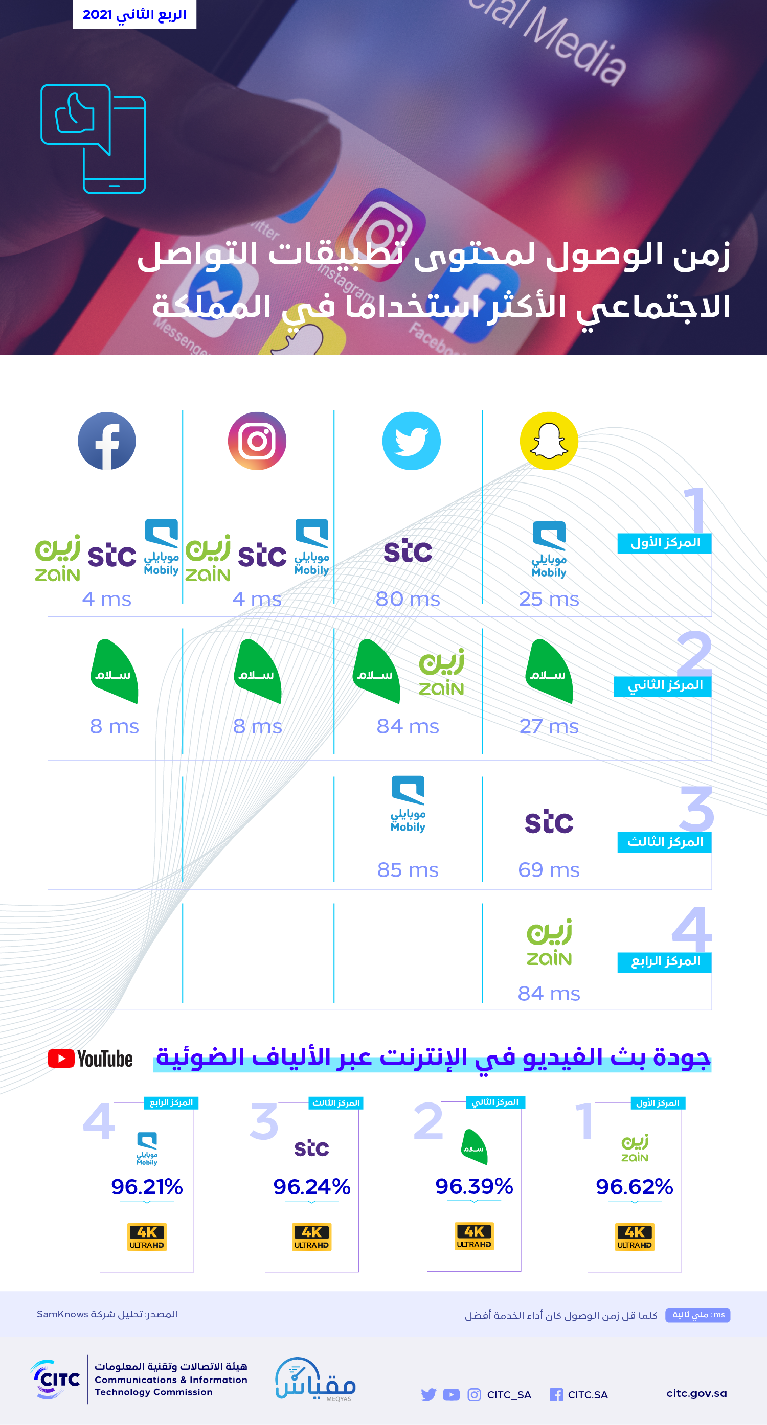 أصدرت هيئة الاتصالات وتقنية المعلومات تقرير الربع الثاني من عام 2021، لمؤشرات سرعة الإنترنت وسرعة الوصول للمحتوى الرقمي في المملكة “مقياس”، الذي كشف عن تسجيل شركة “موبايلي” لأفضل سرعة وصول لمحتوى تطبيق (سناب شات)، فيما سجلت شركة “STC” أفضل سرعة وصول لتطبيق (تويتر)، وتسجيل كل من شركة (STC، وموبايلي، وزين) أفضل سرعة وصول لتطبيقي (فيسبوك، وإنستقرام).