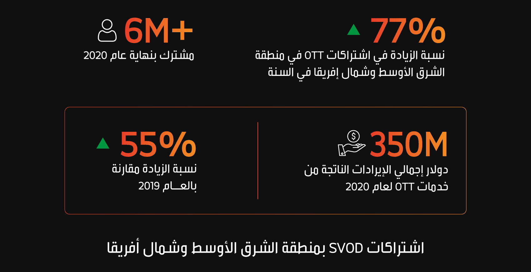 وبلغت الإيرادات الناتجة عن خدمات فيديو اشتراك OTT في منطقة الشرق الأوسط وشمال أفريقيا 350 مليون دولار أمريكي في عام 2020، وهي زيادة بنسبة 55٪ عن عام 2019.