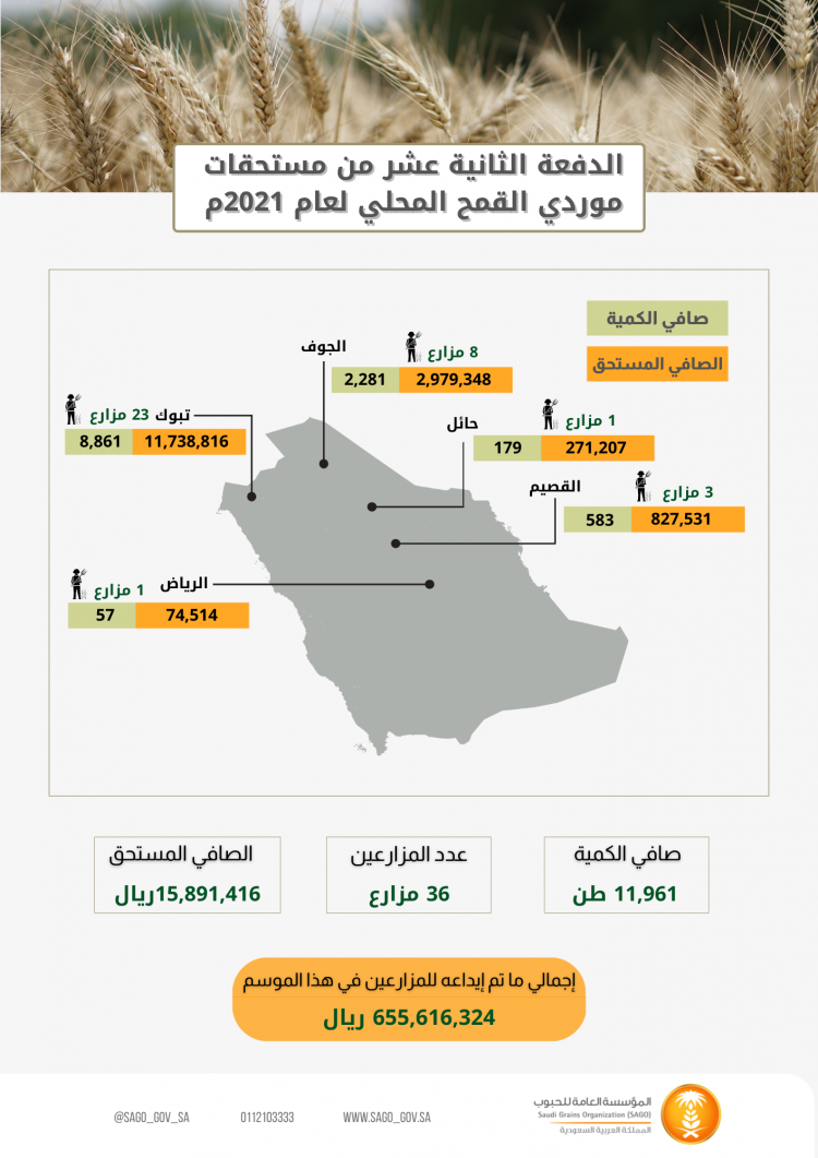 وبلغ إجمالي ما تم إيداعه لحسابات المزارعين البنكية لهذه الدفعة مبلغ (15.891.416) ريال، لصافي كمية مستلمة (11.961) وذلك لعدد (36) مزارعاً، وبذلك يبلغ إجمالي ما تم إيداعه منذ بداية الموسم مبلغ (655.616.324) ريال لعدد (1823) مزارع وبكمية (496.742) طن.