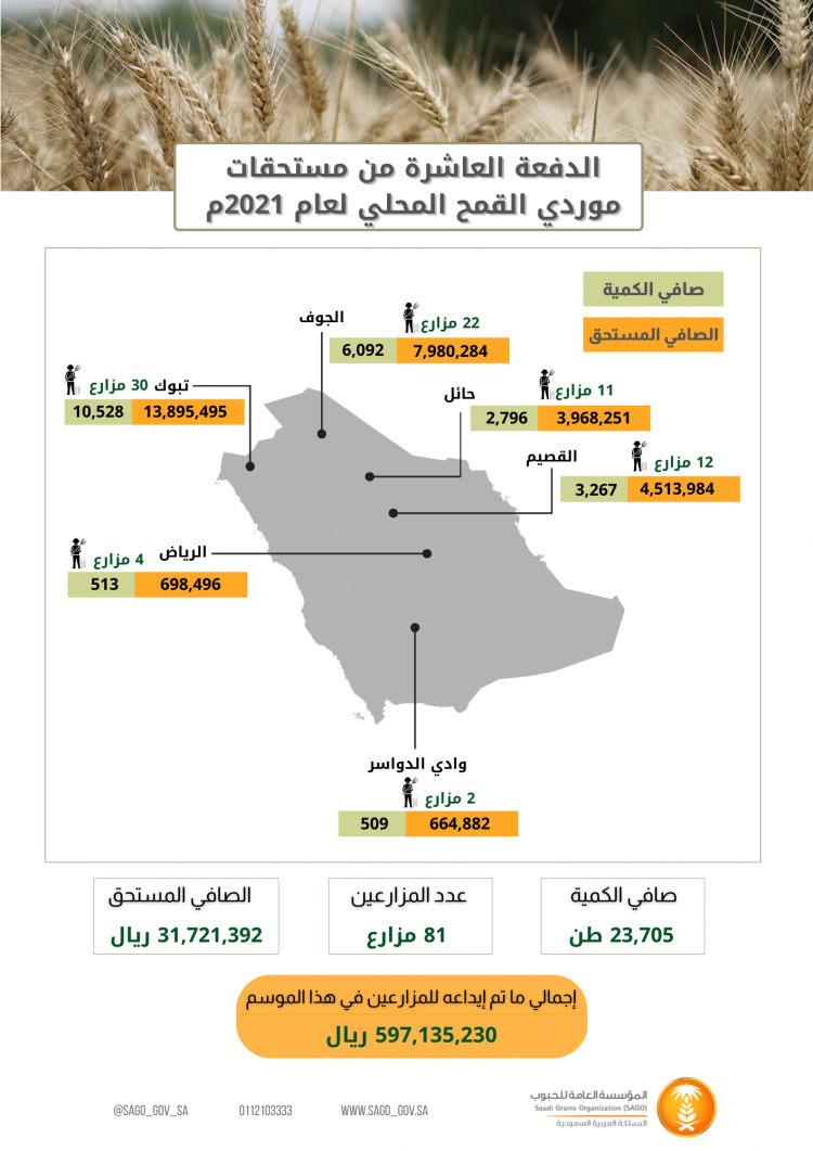 وبلغ إجمالي ما تم إيداعه لحسابات المزارعين البنكية لهذه الدفعة مبلغ (31.721.392) ريال، لصافي كمية مستلمة (23.705) وذلك لعدد (81) مزارعاً، وبذلك يبلغ إجمالي ما تم إيداعه منذ بداية الموسم مبلغ (597.135.230) ريال لعدد (1696) مزارع وبكمية (454.439) طن.