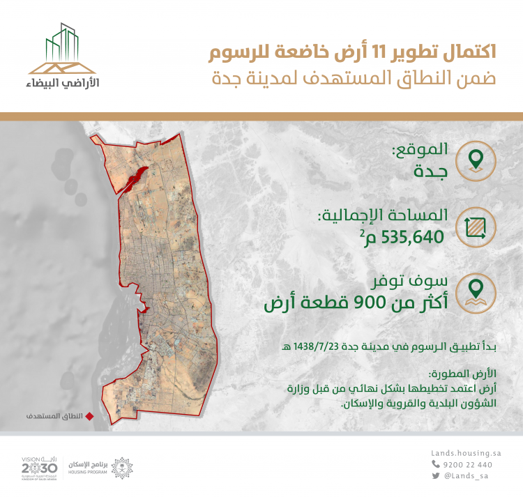 أعلن برنامج الأراضي البيضاء عن الانتهاء من تطوير 11 أرضاً خاضعة للرسوم من قِبل ملاكها في جدة بمساحة إجمالية للأراضي المطورة تجاوزت 535 ألف م2، وذلك في إطار استهداف البرنامج دعم العرض والمساهمة في إيجاد سوق عقاري متوازن، حيث تُعنى المرحلة الحالية بالأراضي غير المُطورة بمساحة 10 آلاف م2 فأكثر والواقعة ضمن النطاق المُعلن عنه عند إطلاق البرنامج في مرحلته الأولى عام 2017 والبدء في إصدار أوامر السداد (الفوترة).
