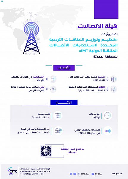 أصدرت هيئة الاتصالات وتقنية المعلومات، وثيقة توزيع وتنظيم النطاقات الترددية المحددة لاستخدامات الاتصالات المتنقلة الدولية (IMT) بنسختها المحدثة، وذلك في إطار تنفيذ مبادرات “الاستراتيجية الوطنية للطيف الترددي” وتنفيذ خطة تمكين الاستخدامات التجارية والمبتكرة للطيف الترددي 2021م-2023م، ويأتي ذلك مواكبة للتحول الاستراتيجي في دور الهيئة كمنظم رقمي وامتداداً لجهودها في دعم وتمكين تحوّل المملكة إلى مجتمع رقمي.