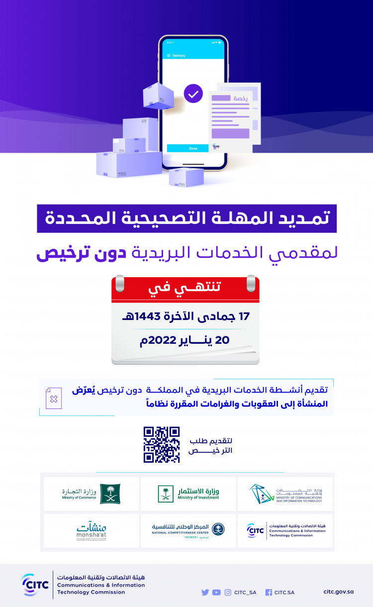 أعلنت هيئة الاتصالات وتقنية المعلومات عن تمديد المهلة التصحيحية الممنوحة للمنشآت والأفراد العاملين في تقديم أنشطة الخدمات البريدية في المملكة دون ترخيص وبشكل مخالف للأنظمة والقوانين ثلاثة أشهر إضافية تبدأ من تاريخ اليوم الخميس الموافق 21 أكتوبر من 2021، وتنتهي في 20 يناير 2022م، وذلك لإتاحة المزيد من الفرص لمقدمي الخدمات البريدية لتصحيح أوضاعهم والاستفادة من مزايا المهلة التصحيحية في ظل الإقبال الملحوظ على استخراج التراخيص النظامية لأنشطتهم خلال الفترة الماضية.