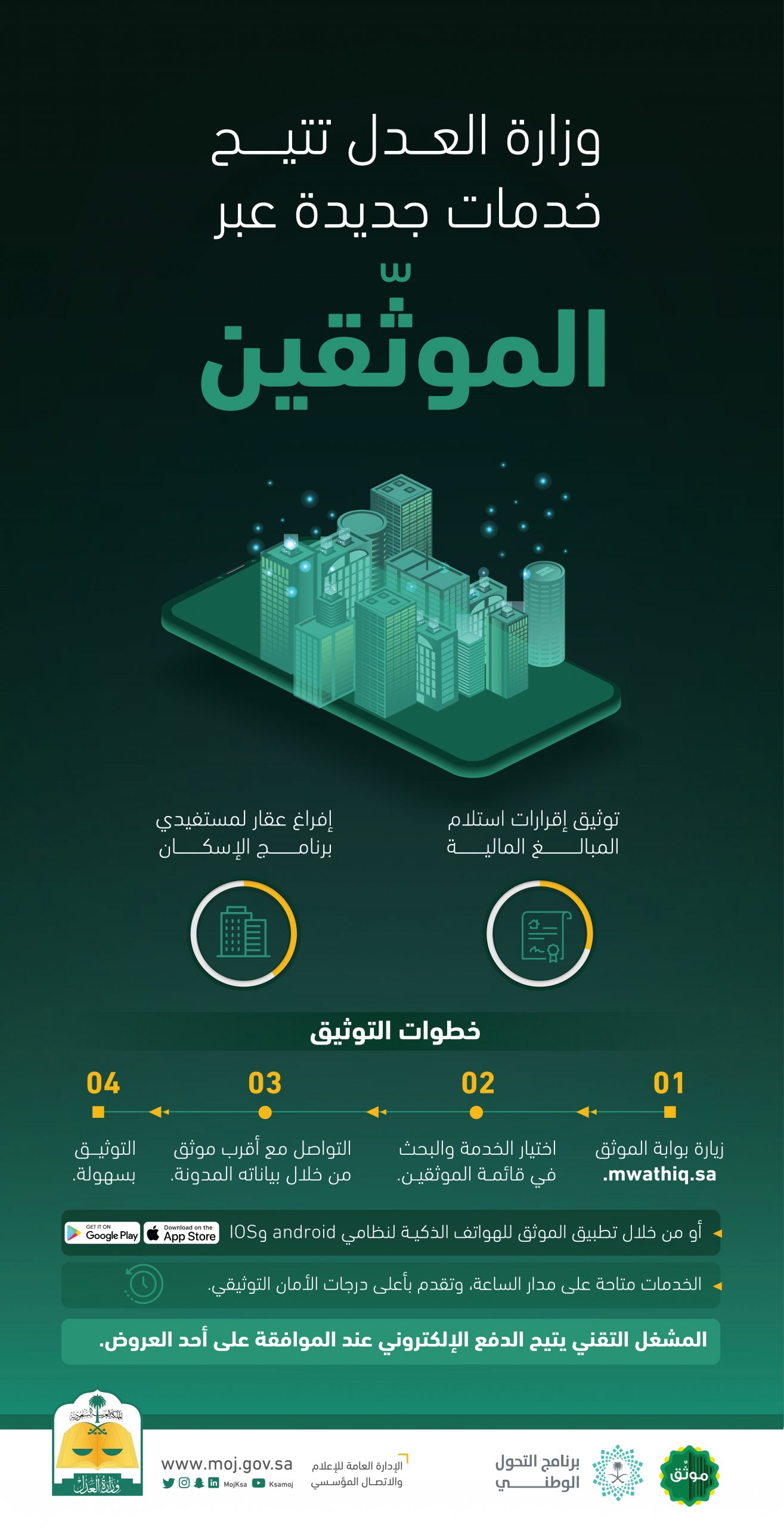في إطار سعيها لتطوير خدمة الموثّق وتسهيل عمليات التوثيق؛ أعلنت وزارة العدل إتاحة خدمات جديدة، تشمل الإقرارات المالية والتوسع في إفراغ العقارات لتشمل إفراغ عقارات المستفيدين من برنامج “سكني”، لتوفير الوقت والجهد وتحسين الخدمات المقدمة للمستفيدين.
