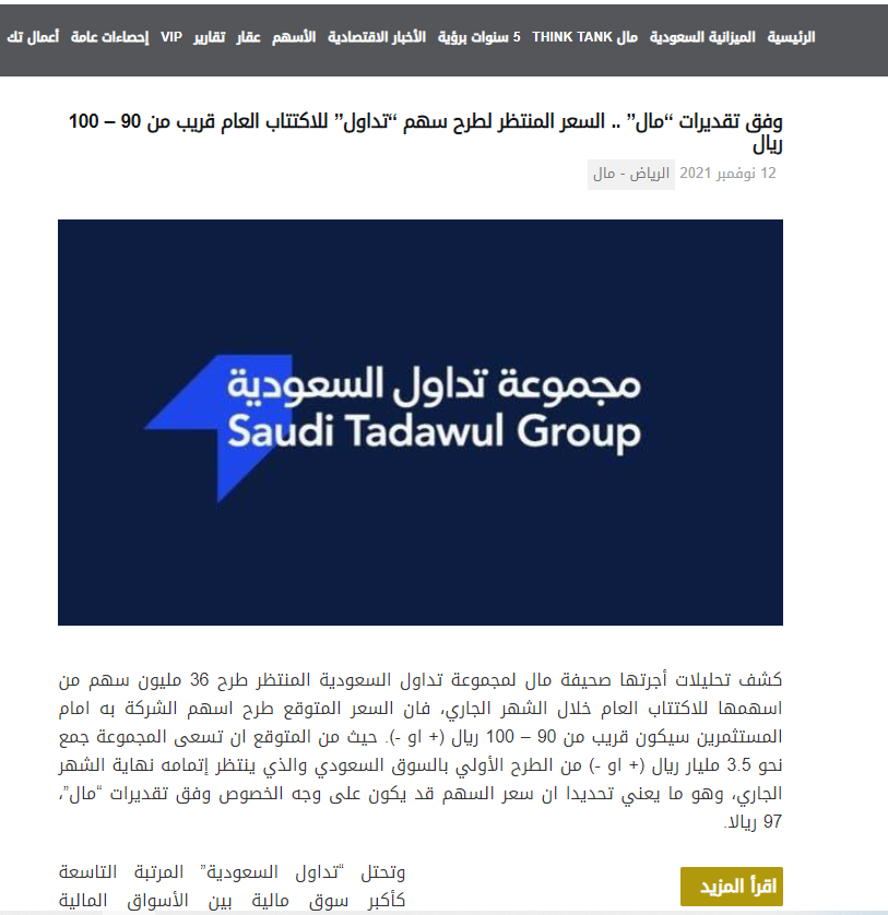 وكانت تحليلات أجرتها صحيفة مال لاكتتاب مجموعة تداول السعودية المنتظر طرح 36 مليون سهم من اسهمها للاكتتاب العام خلال الشهر الجاري، أن السعر المتوقع طرح اسهم الشركة به امام المستثمرين سيكون قريب من 90 – 100 ريال (+ او -). حيث من المتوقع ان تسعى المجموعة جمع نحو 3.5 مليار ريال (+ او -) من الطرح الأولي بالسوق السعودي والذي ينتظر إتمامه نهاية الشهر الجاري، وهو ما يعني تحديدا ان سعر السهم قد يكون على وجه الخصوص وفق تقديرات “مال”، 97 ريالا.