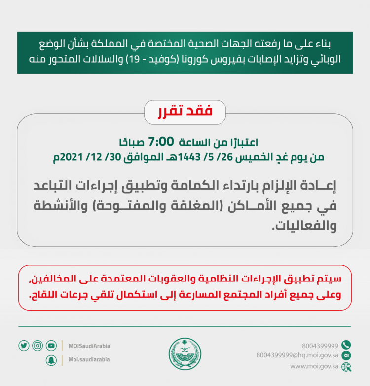 إعادة الإلزام بارتداء الكمامة وتطبيق إجراءات التباعد في جميع الأماكن ( المغلقة ، والمفتوحة ) والأنشطة والفعاليات وذلك اعتباراً من الساعة 00 : 7 من صباح يوم الخميس 26 جمادى الأولى 1443هـ الموافق 30 ديسمبر 2021م.