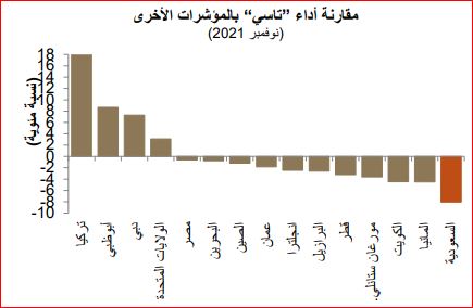 كشفت شركة جدوى للاستثمار تسجيل مؤشر الاسهم السعودية “تاسي” أكبر تراجع شهري له منذ مارس 2020، مع ظهور أنباء المتحور “أوميكرون”. حيث تراجع المؤشر بنسبة 8%، على أساس شهري بنهاية نوفمبر، نتيجة لزيادة تعمق المزاج السلبي للمستثمرين جراء التراجع الحاد في أسعار النفط.
