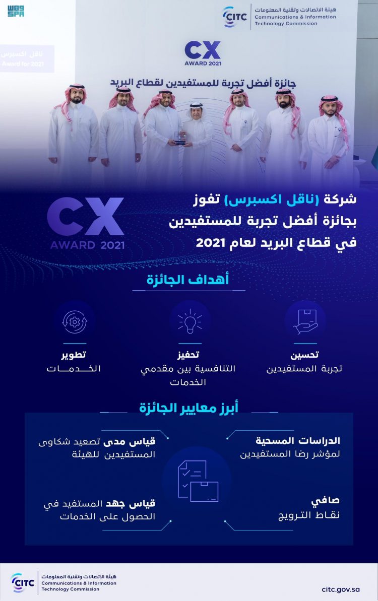 أعلنت هيئة الاتصالات وتقنية المعلومات عن فوز شركة ناقل اكسبرس بجائزة أفضل تجربة للمستفيدين في قطاع البريد لعام 2021م ” CX Award 2021″، التي تهدف إلى إيجاد روح التنافس بين الشركات لتطوير وتحسين الأداء من أجل تقديم خدمات مميزة للمستفيدين ورفع الوعي لديهم من خلال تسليط الضوء على أداء مقدمي خدمات البريد.