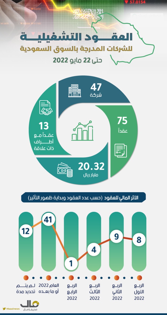 كشف رصد لصحيفة مال عن قيام 47 شركة مدرجة بالسوق المالية بتوقيع 75عقداً تشغيلياً منذ بداية العام 2022 وحتى نهاية يوم الأحد 22 مايو الجاري، تم الإعلان عن قيمة 63 عقداً منها وبلغت قيمتها الإجمالية 20.32 مليار ريال، بينما لم يتم تحديد قيمة 12 عقداً منها، حيث كانت مرتبطة بأنشطة يتم تنفيذها على فترات وبقيم متغيرة حسب طبيعة النشاط، ومنها 13 عقداً مع أطراف ذات علاقة (8 منها لشركات تأمين).