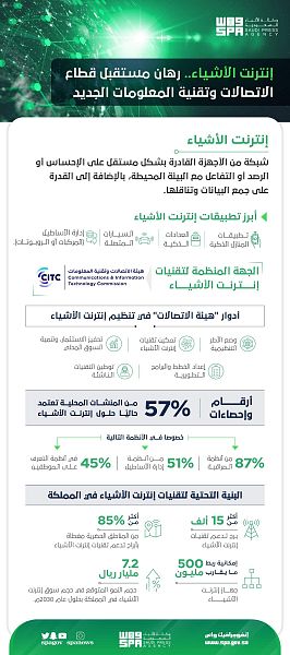 وتعمل هيئة الاتصالات وتقنية المعلومات على مواكبة تلك التطورات وتنظيم وتبني تقنيات إنترنت الأشياء وتحفيز الاستثمار فيها، بهدف تمكين وتعزيز التحول الرقمي في المملكة ومضاعفة الجهود في تبني تطبيقات إنترنت الأشياء، التي بدأت في التوسع والانتشار بين مختلف المنشآت، حيث تشير الإحصاءات إلى اعتماد 57% من المنشآت المحلية حالياً لحلول تقنية تعتمد على إنترنت الأشياء، متمثلة في أنظمة المراقبة والتحقق لتصل نسبة تفعيلها في الجهات المحلية إلى 87%، بينما تصل نسبة استخدام أنظمة إدارة الأسطول إلى 51%، كما تعتمد 45 % من هذه المنشآت على حلول إنترنت الأشياء في أنظمة التعرف على الموظفين.